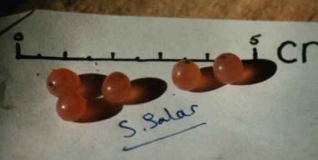 The dark eye of these salmon eggs, is clearly visible through the semi-transparent shell of the egg